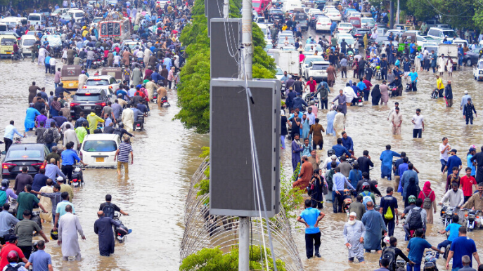 People wade through a flooded Sharea Faisal after the monsoon rain in Karachi on August 19, 2025. Photo: Reuters