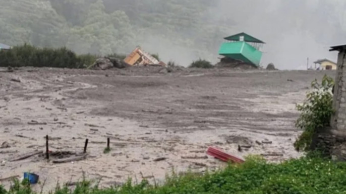The floods swept through Uttarkashi district on Tuesday, sending a torrent of water cascading down from the mountains into Dharali village, submerging roads and buildings along the way. Photo: UNB