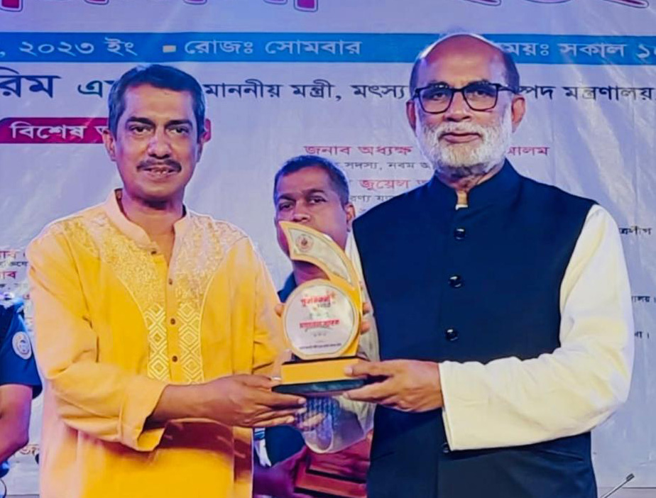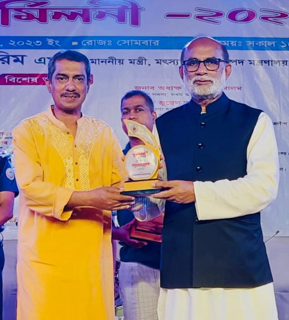 Minister of Fisheries and Livestock of SM Rezaul Karim MP handed over the memento to senior journalist Asaduzzaman Shamrat.